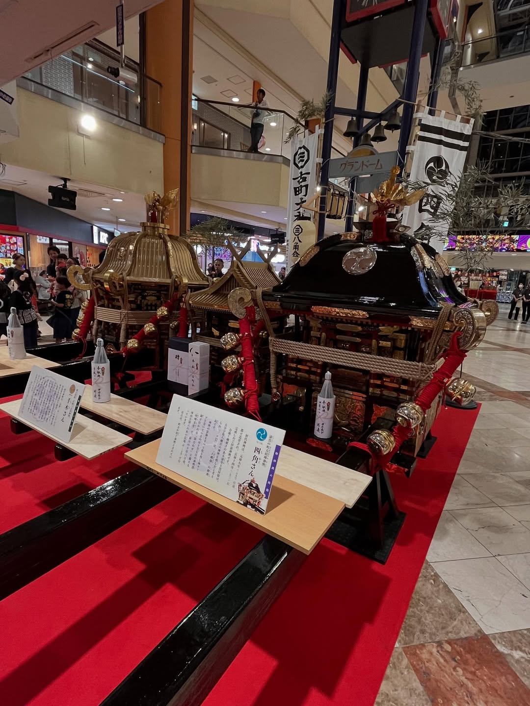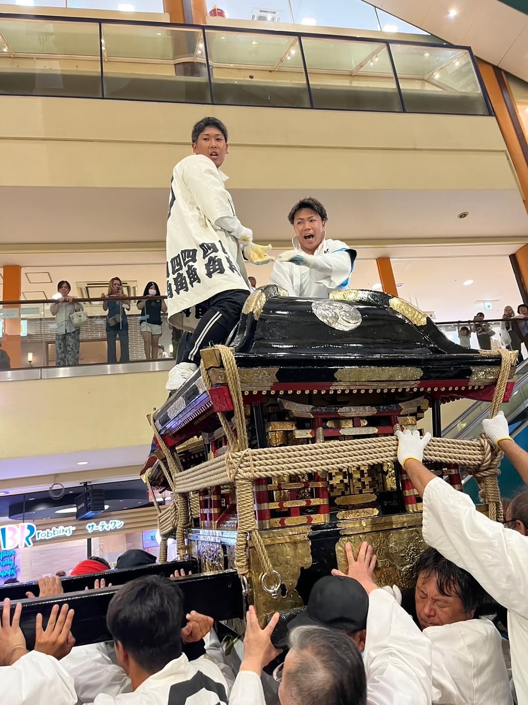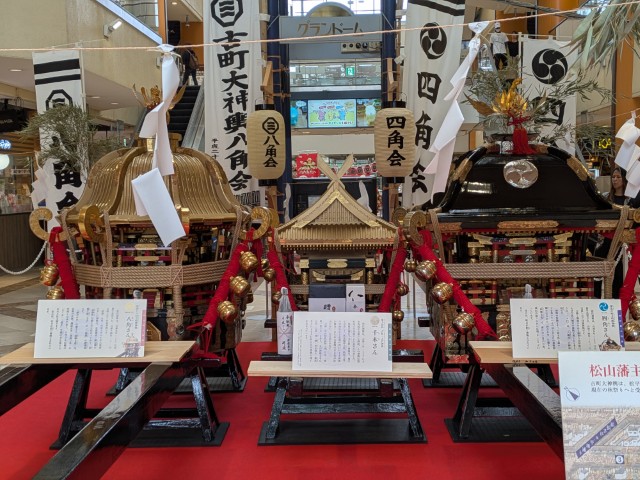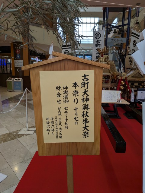活動報告 2025年9月24日 フジグラン松山に神輿搬入・展示の様子 2025年9月26日 フジグラン松山での展示の様子 古町大神輿(千木神輿・八角神輿・四角神輿)の主な活動場所 大三島神社(愛媛県松山市萱町4丁目)・・・10月5日神事、10月7日本祭り宮出し・宮入り 城山公園 ふれあい広場・・・10月6日ロープ巻き、10月7日本祭り 神輿鉢合わせ